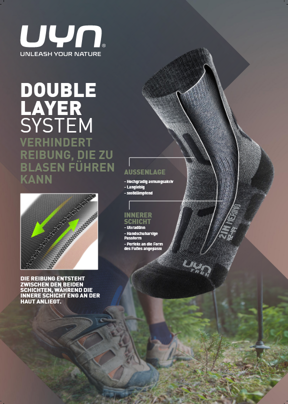 - UYN 2IN = Doppellagiger Strumpfaufbau = 2 in Eins Socke vermindert Reibung / das Blasenrisiko